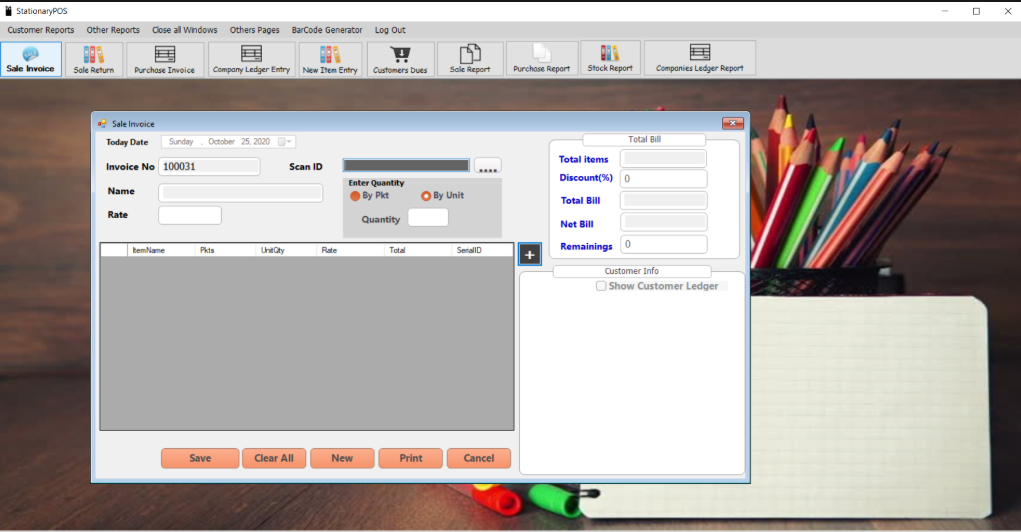 - Sales Invoice: Fast transaction entry with barcode scanning, discounts, and tax calculations