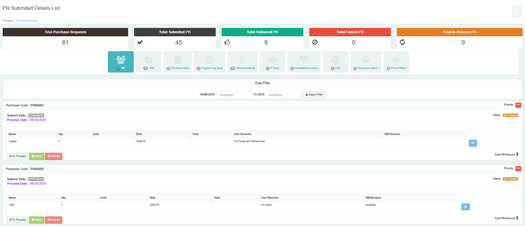 - Purchase Department: Supplier management, purchase orders, GRNs, and cost control